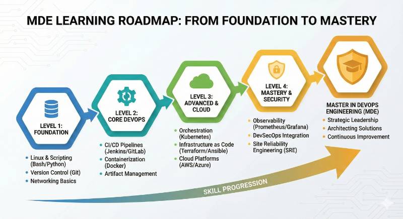 A well-structured preparation plan is key to succeeding in the Master in DevOps Engineering (MDE) certification exam. The timeline below offers three stages depending on how much time you can dedicate to studying: a 7–14 day plan, a 30-day plan, and a more thorough 60-day plan.