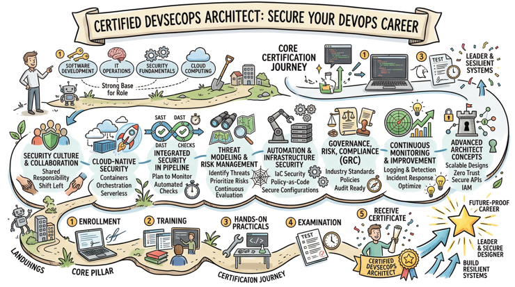 Certified DevSecOps Architect is an architect-level certification for professionals who want to design secure DevOps systems at enterprise scale. Based on the official page, the program goes beyond basic DevSecOps practices and focuses on architecture decisions: security blueprints, resilient delivery design, secure cloud-native systems, compliance-aware pipelines, and end-to-end security integration across development, operations, and infrastructure.
